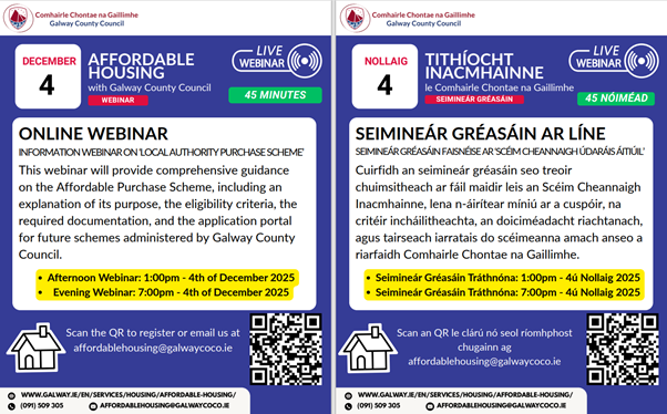 Thursday 4th December 2025 at 1:00pm and 7:00pm - Online Galway County Council are hosting a free public webinar at 1:00 pm and 7:00 pm on Thursday, December 4th 2025, to provide a detailed briefing on Galway County Council’s Affordable Housing Purchase Scheme. This initiative follows a survey the Housing Department conducted in October, which revealed that almost one-third of respondents were not familiar with the scheme. The findings underline the importance of ensuring that households have clear and accessible information on the supports available to them when seeking to purchase a home. The webinar will outline: ♦How the scheme operates ♦Eligibility criteria and application requirements ♦Documentation needed for applicants ♦How prices are determined ♦The role of the Revenue Help to Buy Scheme in supporting first-time buyers. You can register for the Webinar here: https://www.tinyurl.com/galwaywebinar