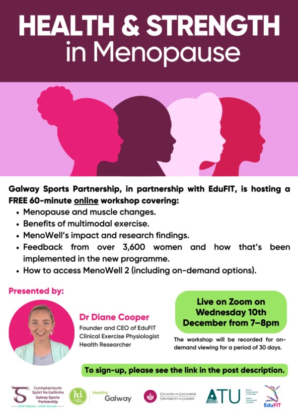 Wednesdays 10th December 2025 7pm - 8pm Online (via Eventbrite registration) Galway Sports Partnership is hosting a free online workshop with Dr. Diane Cooper, Founder & CEO of Edufit on the topic ‘Health & Strength in Menopause’. This informative session will cover: ♦Menopause and muscle changes ♦Benefits of strength training and multimodal exercise ♦MenoWell’s impact and research findings (feedback from 3,600 women) ♦Addressing common health concerns from Women in Midlife ♦How to access MenoWell 2.0, 6 week programme, coming January 2026 and FREE to women living in Galway City and County Register now: https://www.eventbrite.ie/e/1969243373942?aff=oddtdtcreator