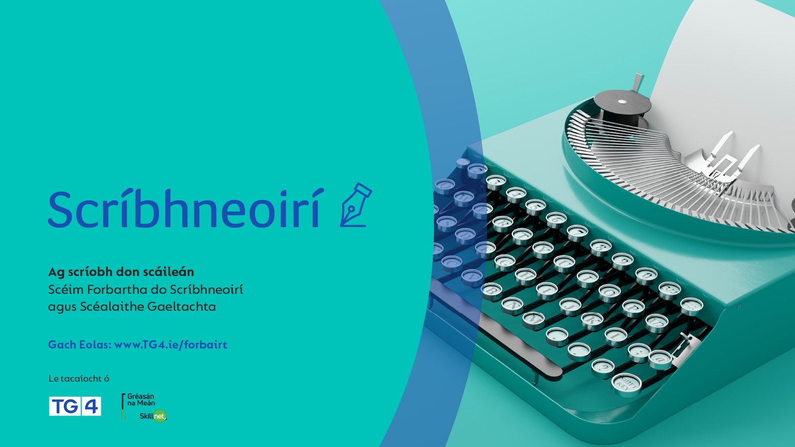 Seol d’iarratas isteach roimh 15ú Nollaig 2025 Tá an cúrsa seo dírithe ar scríbhneoirí Gaeltachta atá ag plé le scríbhneoireacht i gcoitinne, na taibhealaíona, drámaíocht stáitse, nó filíocht agus a bhfuil suim acu dul i muinín a gcruthaitheacht agus saibhreas teanga a chur i dtreo scríbhneoireacht don scáileán. Tá súil go spreagfaidh an cúrsa seo tuiscint & taithí i measc scríbhneoirí Gaeltachta i dtreo na meán. Cuirfear fáilte roimh iarratais ó scríbhneoirí a bhfuil Gaeilge ó dhúchas acu agus atá fréamhaithe i bpobail Ghaeltachta.Is scéim í seo atá á rith ag TG4, le tacaíocht ó Gréasán na Meán Skillnet agus i gcomhar le Ealaín na Gaeltachta, le scríbhneoirí Gaeltachta a spreagadh agus a fhorbairt le scríobh don scáileán. Cuir iarratas isteach: https://www.tg4.ie/ga/corporate/traenail-forbairt/ag-scriobh-don-scailean/