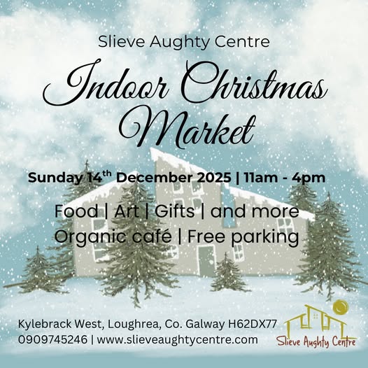 Sunday 14th December 2025 - Slieve Aughty Centre Kylebrack West, Loughrea H62 DX77 The Slieve Aughty Centre Christmas Market is coming and this year everything will be indoors! Get ready to step into a winter wonderland! Join us for our annual Christmas Market — filled with holiday cheer, local crafts, delicious treats, twinkling lights, and festive music. What to expect: Handmade gifts, warm drinks, festive music, and more! Bring your friends, family, and festive spirit — this is one holiday tradition you won’t want to miss.