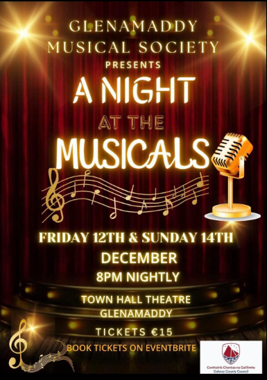 Friday 12th and Sunday 14th December 2025 8pm - Town Hall Theatre, Glenamaddy, Co. Galway Join us for a night of singing, dancing, and pure musical magic with Glenamaddy Musical Society- A night at the Musicals! Get ready to be entertained by our talented cast as they bring the magic of musical theater to life on stage. Tickets available on Eventbrite