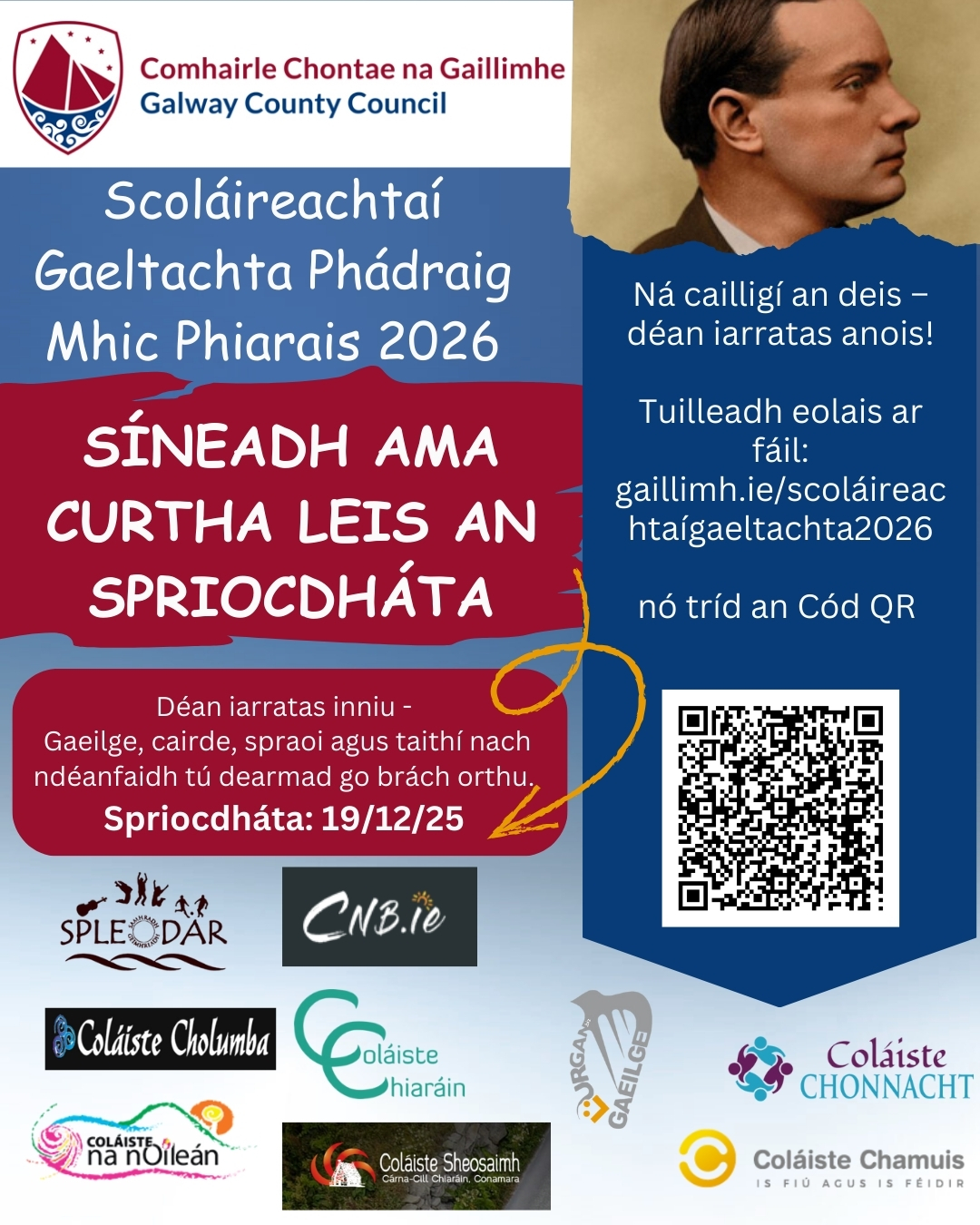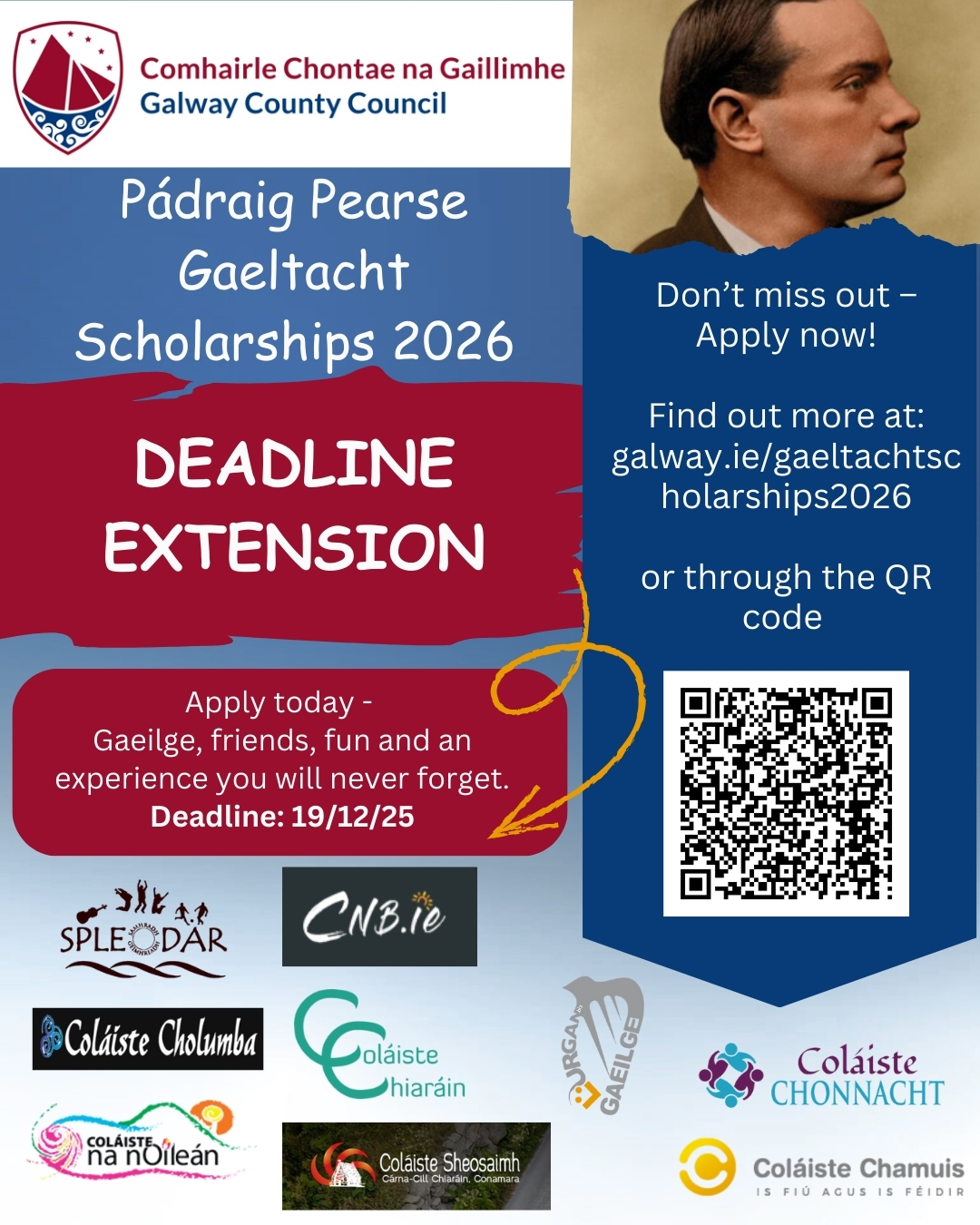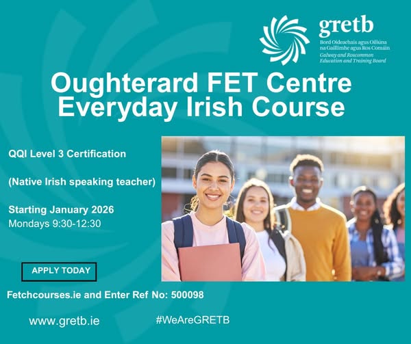 Deadline: Friday 19th December 2025 Galway County Council is now inviting applications for the 2026 Pádraig Pearse Gaeltacht Scholarships. The scholarships give students the opportunity to attend a fully funded Gaeltacht summer college course in Connemara, where they can improve their Irish language skills while enjoying a range of engaging activities. Applications in Irish are welcome. More information available at: https://www.gaillimh.ie/.../applications-now-open-padraig...