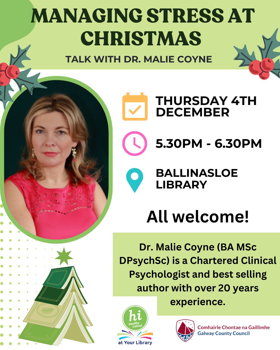 Thursday 4th December 2025 5:30pm – 6:30pm Ballinasloe Library, Ballinasloe Co. Galway 053 T320 The festive season can be joyful, but it can also bring stress. Learn practical tips to manage it and make this Christmas more peaceful and enjoyable. Join us for an insightful talk with Dr. Malie Coyne, Chartered Clinical Psychologist and best-selling author with over 20 years of experience. No booking required - All welcome!