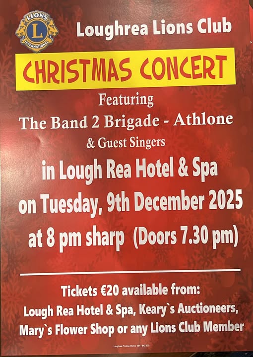 Tuesday 9th December 2025 8pm Lough Rea Hotel & Spa, Athenry Rd, Loughrea, Co. Galway H62Y189 Tickets €20 available now from Lough Rea Hotel & Spa, Keary's Auctioneers, Mary's Flower Shop or any Lions Club Member.