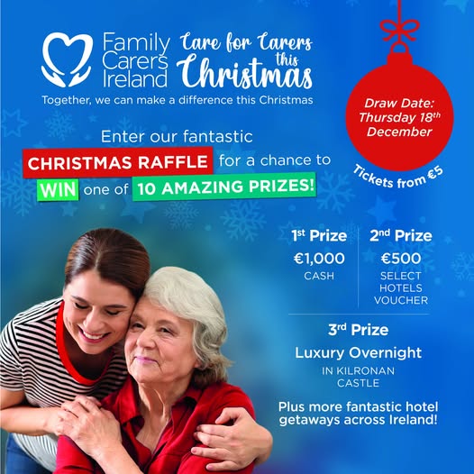 Draw date: Thursday 18th December 2025 Christmas is a time for togetherness, and for thousands of family carers across Ireland. It’s also a time when care continues quietly at home. This festive season, you can help bring comfort and joy to those who give so much by supporting Family Carers Ireland by taking part in our National Christmas Raffle: https://www.idonate.ie/raffle/ChristmasRaffle25 Every act of kindness helps us continue providing vital supports to carers nationwide.