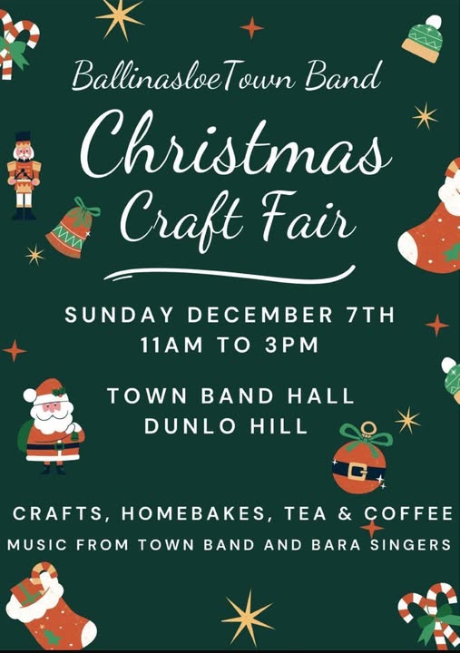 Sunday 7th December 2025 from 11am to 3pm - Ballinasloe, Co. Galway An ideal opportunity to pick up some handcrafted Christmas gifts Please support Ballinasloe Town Band Christmas Craft Fair.