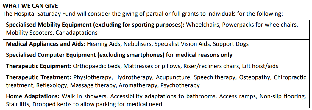 The Hospital Saturday Fund is a registered Charity whose aims are to provide assistance through its charitable funds for Individuals with a medical condition or disability who would benefit from assistance with the purchase of specialised equipment or from particular forms of treatment. Please note that to administer our grant making process as efficiently as possible we do not accept applications directly from members of the public. The Hospital Saturday Fund will only correspond with the supporting medical professional/supporter organisation and not the individual. If you are an individual in need, please approach a suitable organisation to make the application on your behalf. We are unable to take calls from the individual applicant or potential applicant. If necessary, the supporter should email us at: charity@hsf.eu.com Applications must be made online at www.hospitalsaturdayfund.org Only apply for items and therapies that are shown on our list below. This will avoid wasting our time and yours.