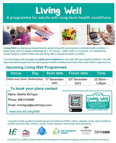 Next dates coming up: Wednesdays 3rd & 10th December 2025, 10:30am - 1:00pm - Online This is a free group programme aimed to help people manage their long-term health conditions and improve their wellbeing. Anyone with any chronic illness such as diabetes, arthritis, COPD, cardiac illness, anxiety, etc. can benefit from these workshops, which are delivered either online or face to face. The upcoming programme will be delivered online by trained facilitators on Zoom, once a week, over a 6-week period in a friendly and supportive setting. We will have further face to face programmes scheduled in the new year. To book your place contact Martha McTigue 086 014 2688 or mmctigue@southmayo.com