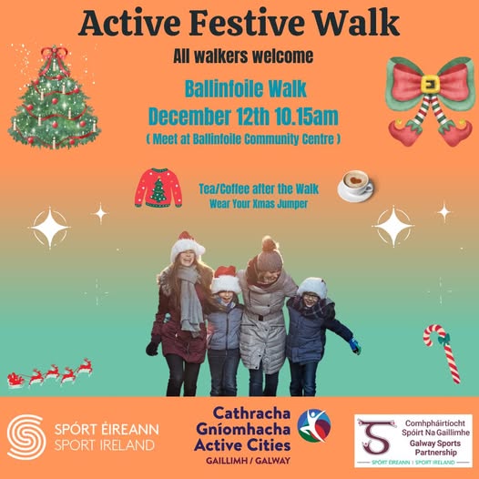 Friday 12th December 2025 at 10:15am Ballinfoile Community Centre, Ballinfoile, Co. Galway Join Us for an Active Festive Walk! Get into the holiday spirit with a refreshing walk in Ballinfoile! Meet at: Ballinfoile Community Centre Date on Friday, all walkers welcome! Enjoy tea/coffee after the walk. Don’t forget to wear your Christmas jumper! Let’s celebrate the season, stay active, and connect with the community. Spread the word and bring a friend!