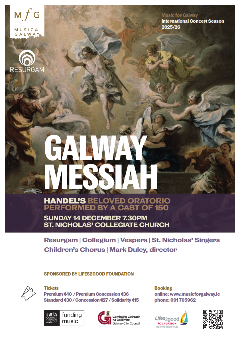 Sunday 14th December 2025 at 7:30 pm St. Nicholas’ Collegiate Church, Galway City Galway Messiah is a new approach to presenting Handel’s seasonal oratorio, born right here in Galway. A performance by the people of Galway for the people of Galway, this is a truly cross-community production in which amateur singers share a stage with a stellar lineup of professionals, all directed by Mark Duley. This performance offers an opportunity to the St. Nicholas Singers and other adults and children throughout the community to work with Galway’s professional choir Resurgam and soloists, and Galway’s baroque instrumental ensemble Vespera to bring a uniquely Galway performance to life. For more information, please visit: https://musicforgalway.ie/event/galway-messiah/