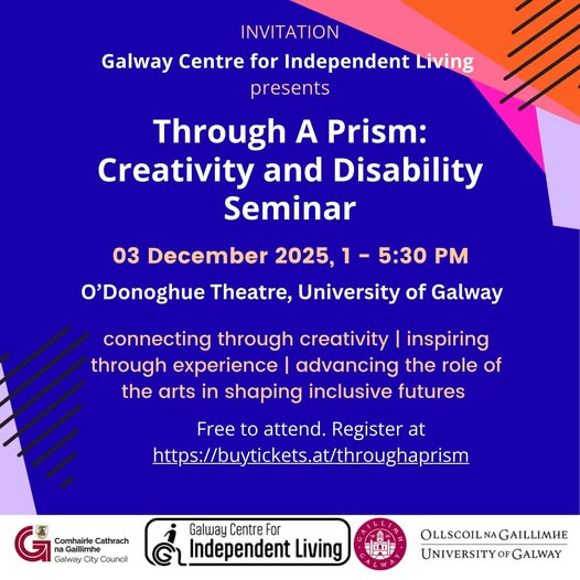 Wednesdays 3rd December 2025 1pm - 5:30pm O'Donoghue Theatre, University of Galway H91 T8WR Through A Prism: Creativity and Disability is brought to you by the creative team David Joyce, Declan Gorman and Joanna McGlynn. Inspired by the 2024 stage production of A Personal Prism by David Joyce the project continues to explore the role of the arts and creativity in raising awareness, advancing advocacy, and documenting lives as lived by people with disability. Free event, book a place here: https://www.tickettailor.com/events/throughaprism/194235