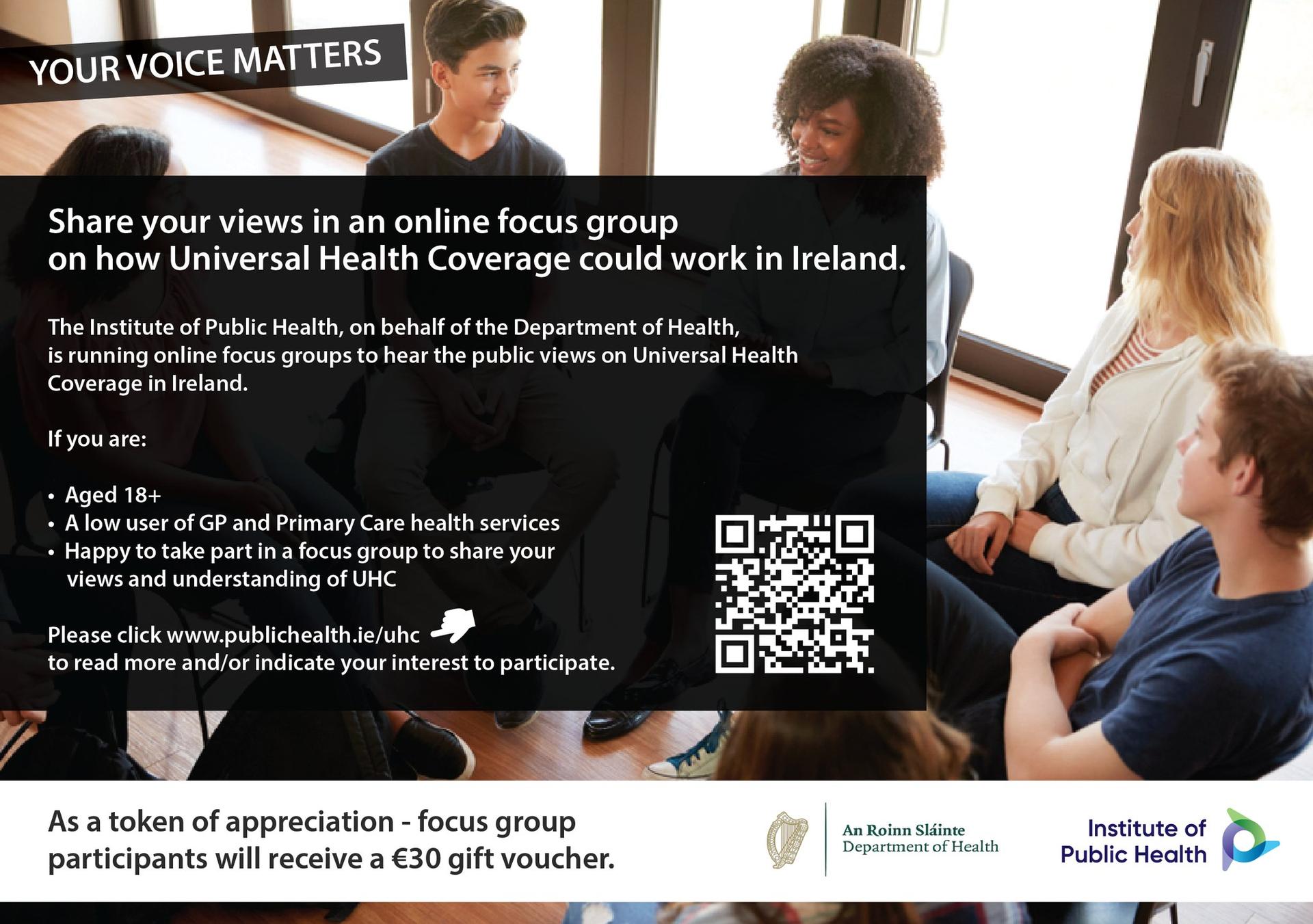 The Department of Health (Ireland) has asked the Institute of Public Health (IPH) to carry out focus groups to hear the public view on Universal Health Coverage (UHC) in Ireland. In the focus groups, the department would like to hear the views of adults who are low users of health care services. Participants may have a Medical Card, a GP Visit Card, private health insurance, or none of these. To be eligible you must be: Aged 18+ living in Ireland; A low user of GP and primary care health services. For more information, please visit: https://www.publichealth.ie/uhc Register your interest: https://www.surveymonkey.com/r/VXL693P