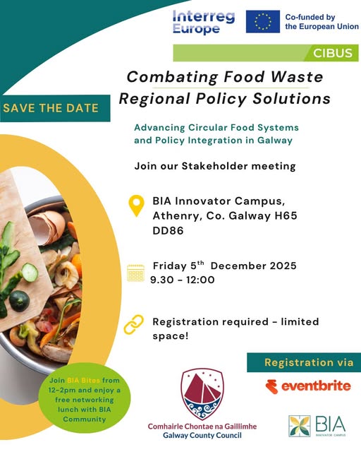 Friday 5th December 2025 9:30 to 12:00 - BIA Innovator Campus, Athenry Co. Galway H65 DD86 Galway County Council invites you to the 4th CIBUS Regional Stakeholder Meeting. This workshop will gather hospitality businesses, educators, policymakers, and community organisations to discuss practical and policy-based actions for reducing food waste. Topics include hospitality waste prevention, food education in schools, and green public procurement. Building on previous meetings and interregional exchanges, this edition will explore how to translate shared insights into concrete pilot ideas that can inform future policy actions. Afterwards, attendees are invited to stay for BIA Bites (12:00–14:00) — a festive networking lunch celebrating the local food and drink community with refreshments, music, and good company. Please use this link to register: https://www.eventbrite.ie/e/1777737804629?aff=oddtdtcreator