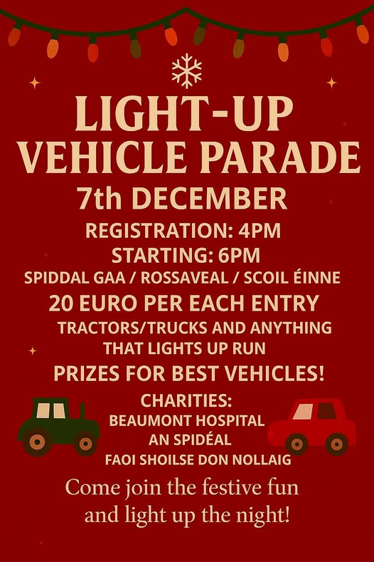 Sunday 7th December 2025 at 6pm - Spiddal GAA, Rossaveal Scoil Einne Co. Galway Come join the festive fun and light up the night! Registration at 4pm. Charities: Beamount Hospital An Spideal, Faoi Shoilse Don Nollaig