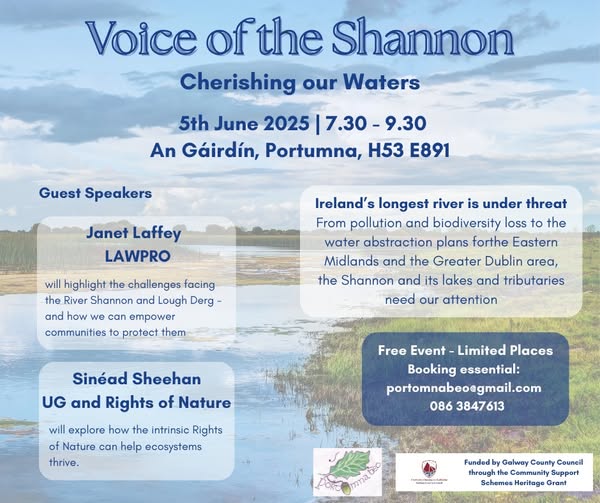 Thursday 5th June 2025 7:30 – 9:30pm An Gáirdín, Portumna, Co. Galway Free event! Ireland’s longest river is in trouble. From pollution and biodiversity loss to controversial water abstraction plans for Dublin and the Eastern Midlands, the Shannon—and its lakes and tributaries—need our voice. Port Omna Beo invites you to an inspiring evening of awareness, insight, and action. Limited places! Booking essential. Book your place by 1st June: portomnabeo@gmail.com 086 3847613.