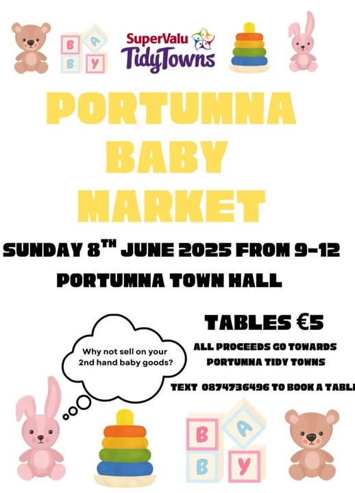 Sunday 8th June 2025 9am until 12 midday - Portumna Town Hall Do you have preloved baby items, baby clothes and baby equipment that you wish to sell, recycle or buy? Why not come along and set up a table with your preloved baby items. Sell your stuff/keep your proceeds. €5 euro per table. All proceeds go towards Portumna Tidy Towns text 086 473 6496 to book a table/spot.