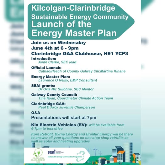 Wednesday 4th June 2025 6pm - 9pm Clarinbridge GAA Clubhouse - H91 YCP3 The Kilcolgan Clarinbridge Sustainable Energy Community (SEC) is excited to launch our Energy Master Plan in conjunction with Laurence O Reilly, Energy Consultant and SEAI. Our Energy Master Plan is the culmination of the last 18 months and provides a roadmap to a cleaner, greener, and more energy-efficient future for our community!