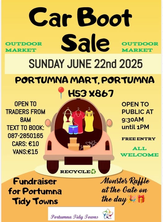 Sunday 22nd June 2025 Portumna Mart, Portumna, Co. Galway H53 X867 Open to the Public from 9:30am. Open to Traders/Sellers from 8am. Bookings: 087 285 0165. This Fundraiser is in aid of Portumna Tidy Towns to purchase new equipment, flowers and plants ALL WELCOME. Free Entry. RAFFLE on the day.