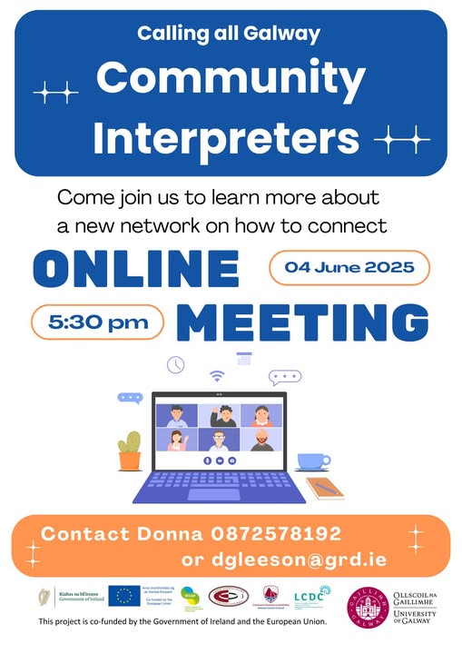 Wednesday 4th June 2025 5:30pm - Online Are you a practising or an aspiring Community Interpreter? Do you interpret in your community in Galway? Please come along to the next Community Interpreter network meeting. To join the meeting or find out more details please contact Donna Gleeson Ryan - Integration and Development officer, SICAP programme, Galway Rural Development 0872578192 or dgleeson@grd.ie