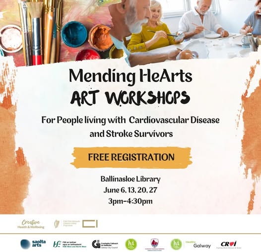 Friday 6th, 13th, 20th and 27th of June 2025 from 3pm to 4.30pm - Ballinasloe Library Saolta Arts are delighted to invite members of the community living with cardiovascular disease, as well as stroke survivors, to their new free art workshops in Ballinasloe Library as part of the Mending HeArts Project. Join us for a relaxed and friendly 4-week art workshop and explore different art mediums. No art experience needed - just come along to have fun, meet others, and get creative in a supportive environment. All materials provided. For more info: https://www.eventbrite.ie/.../mending-hearts-art...