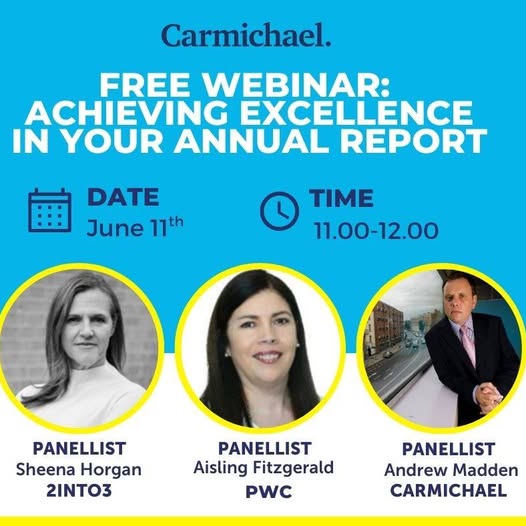 Wednesday 11th June 2025 11.00am - 12.00pm FREE! This 60 minute webinar will include: ♦Preparing for excellence; the structure and process to deliver an excellent annual report. ♦An auditor’s perspective on what is required to deliver an excellent report and the key reporting requirements under Charities SORP. ♦How to move from a good annual report to an excellent annual report – what the assessors and judges in the Good Governance Awards are looking for? Register: https://us02web.zoom.us/.../reg.../WN_mZI82VA6TXelQdyA7p3t_A Find out more: https://www.carmichaelireland.ie/free-webinar-achieving.../