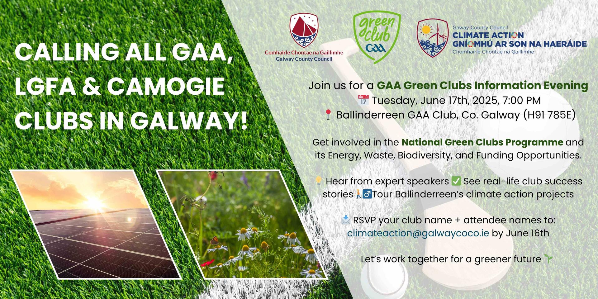 Tuesday 17th June, 2025 at 7:00pm in Ballinderreen GAA Club, Clough Road, Co. Galway H91 785E The Green Clubs Programme—a collaboration between the GAA and local authorities throughout Ireland—was launched in 2020 to support clubs in taking climate action. The upcoming information evening will feature guest speakers and experts on a range of key topics, including Energy, Waste, Biodiversity, and Funding Opportunities. The evening will conclude with a Questions & Answers session and a walkabout tour of the Ballinderreen GAA Green Club, showcasing its innovative climate action projects. Clubs planning to attend are requested to RSVP to climateaction@galwaycoco.ie by Monday, June 16th, 2025.