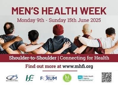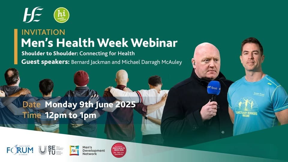 Monday 9th - Sunday 15th of June 2025 Let's Celebrate Men's Health Week 2025! This year’s theme “Shoulder to Shoulder - Connecting for Health” is all about the importance of connectivity and helping each other. Join us to hear some very engaging conversations, insights and advice from our guest. Hosted by Lorcan Brennan, Men’s Development Network. Register here: https://zoom.us/webinar/register/WN_XkmyffvTS4e5TfeNjQcGew