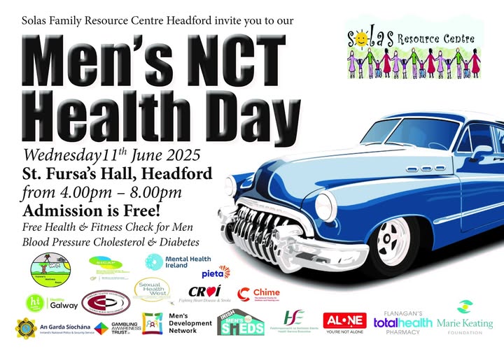 Wednesday 11th June 2025 from 4:00pm to 8:pm St. Fursa's Hall, Headford ADMISSION IS FREE!! Solas Family Resource Centre Headford invite you to the Men's NCT Health Day for Free Health and Fitness Check for Men, Blood Pressure Cholesterol, Diabetes HIV Test and Hearing Test. This is the ideal opportunity for men – of all ages – to get themselves checked out for health and fitness. For more info, please visit https://www.solasfrc.ie/