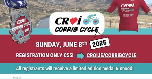 Sunday 8th June 2025 Starting at Dangan Sports Pavillion , Galway Finishing at Croí Heart & Stroke Centre, Galway In 2025, join us in celebrating the 31st Anniversary of the Croí Corrib Charity Cycle and help to continue to lead the fight against heart disease and stroke. The Croí Corrib Charity Cycle, now in it’s 31st year, is one of their most important fundraisers of the year and your support is greatly appreciated! NO ON-THE-DAY REGISTRATION. Registration will close on Saturday, June 7th at 4pm. Registration: €55 For more info, please visit: https://croi.ie/event/31st-croi-corrib-charity-cycle/