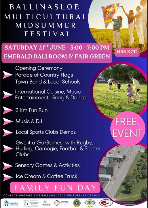 Saturday 21st June from 3:00 to 7:00 PM at the Emerald Ballroom and Fair Green (H53 X7T1) Celebrate Culture, Community and Summer Fun at Midsummer Festival Family Fun Day! Ballinasloe is gearing up for an afternoon of fun, flavour and festivity as the Midsummer Multicultural Festival Family Fun Day. All are welcome – from every background and nationality – to take part in this inclusive celebration of community and culture. Contact 090 964 6516 for further details.