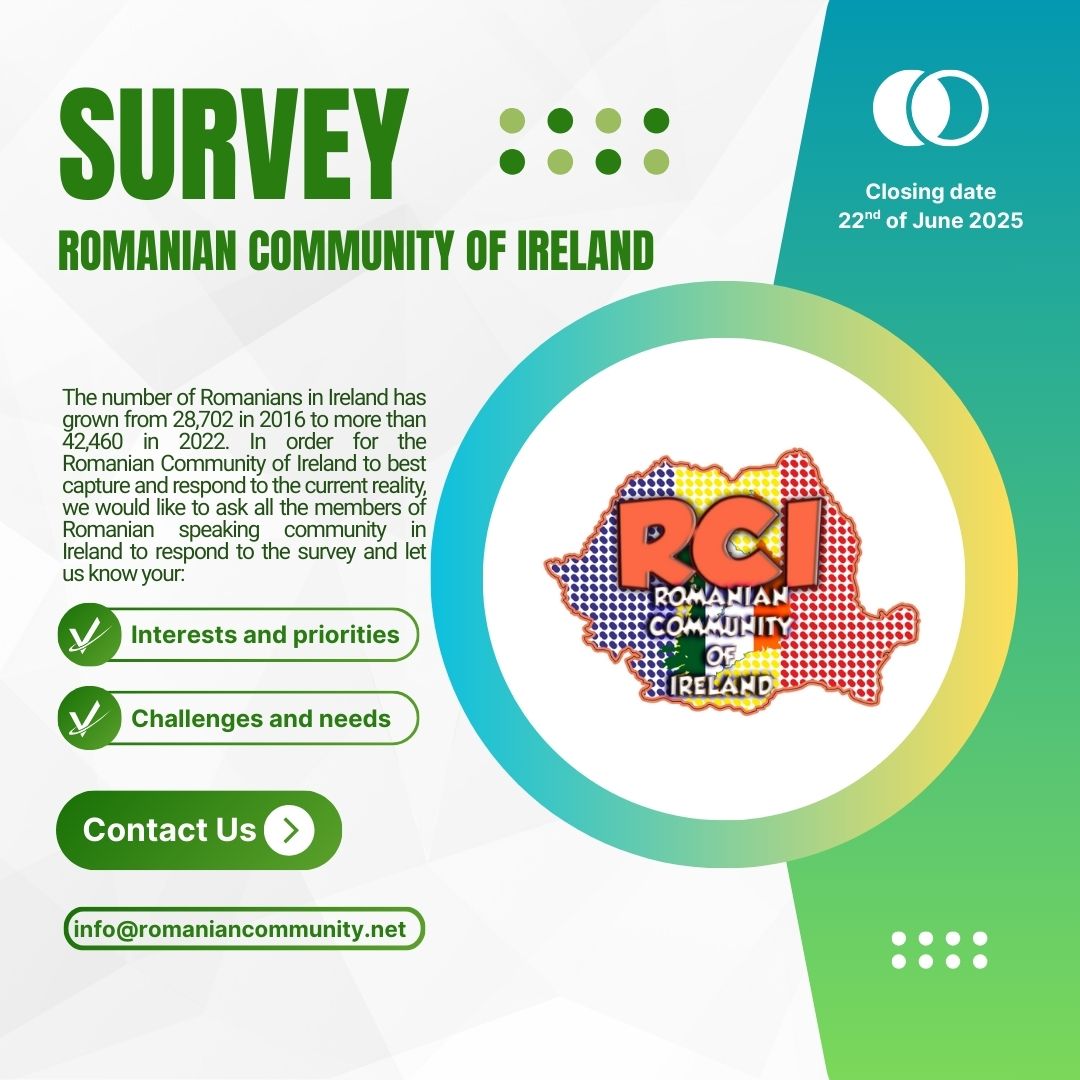 Closing date: Sunday 22nd June 2025 This survey has been put together by the Romanian Community of Ireland (RCI) a not-for-profit organisation which, for more than 27 years, supports the integration, cohesion and the promotion of Romanian identity of the diaspora living in the Republic or Ireland. The number of Romanians in Ireland has grown significantly over the last decade. In order for RCI to best respond to the current reality, it is important to fully understand the interests, challenges and real needs that the Romanian community is currently experiencing. The data and feedback captured through the survey will shape the RCI’s strategic direction for the next five years, the projects it undertakes and the supports that will be offered. For any questions or queries about the survey, please contact info@romaniancommunity.net To fill in the survey, please click HERE