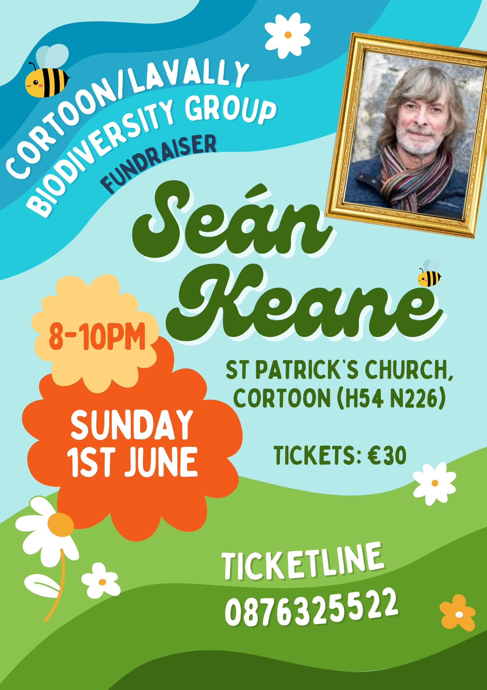 Sunday, 1st June 2025 8:00pm St. Patrick's Church, Cortoon, Tuam, Co. Galway (H54 N226) An Evening with Seán Keane. €30 per person. All proceeds will support the Cortoon / Lavally Biodiversity Group. Places are limited. To reserve a place, please call 087 632 5522.