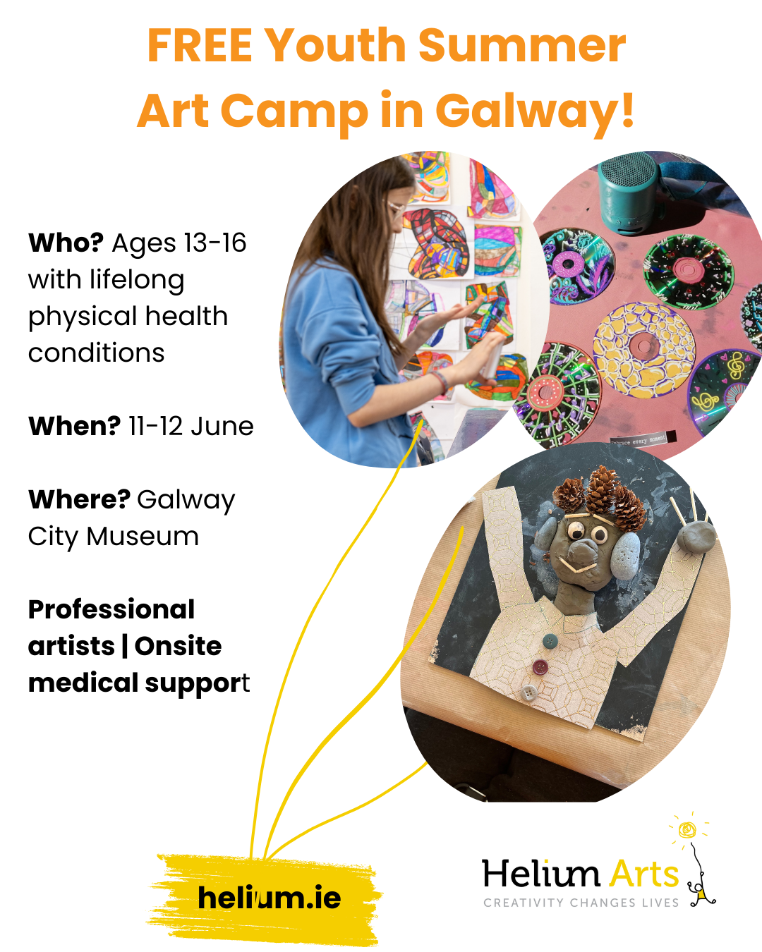 Wednesday 11th and Thursday 12th June 2025 Galway City Museum FREE Youth Summer Art Camp in Galway for young people (age 13–16) living with a lifelong physical health condition (like diabetes, epilepsy, spina bifida, heart conditions, juvenile arthritis, rare conditions, and more) who loves being creative and meeting new friends. This fun and supportive camp is led by professional artists and offers young people the chance to make art, explore their creativity, and connect with others who understand what they’re going through. Sign up here: https://helium.ie/workshops/youth-summer-camp-galway/