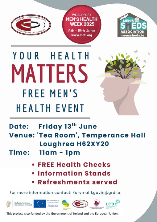 Friday 13th June from 11am to 1pm in the 'Tea Room', Temperance Hall, Loughrea 'Your Health Matters' event! Free Health Checks, Information Stands and refreshments served. Supported by Loughrea Men's Shed and Galway Rural Development. Come along and find out ways you can improve your health and wellbeing. All are welcome to attend. For further information contact Karyn at kgavin@grd.ie