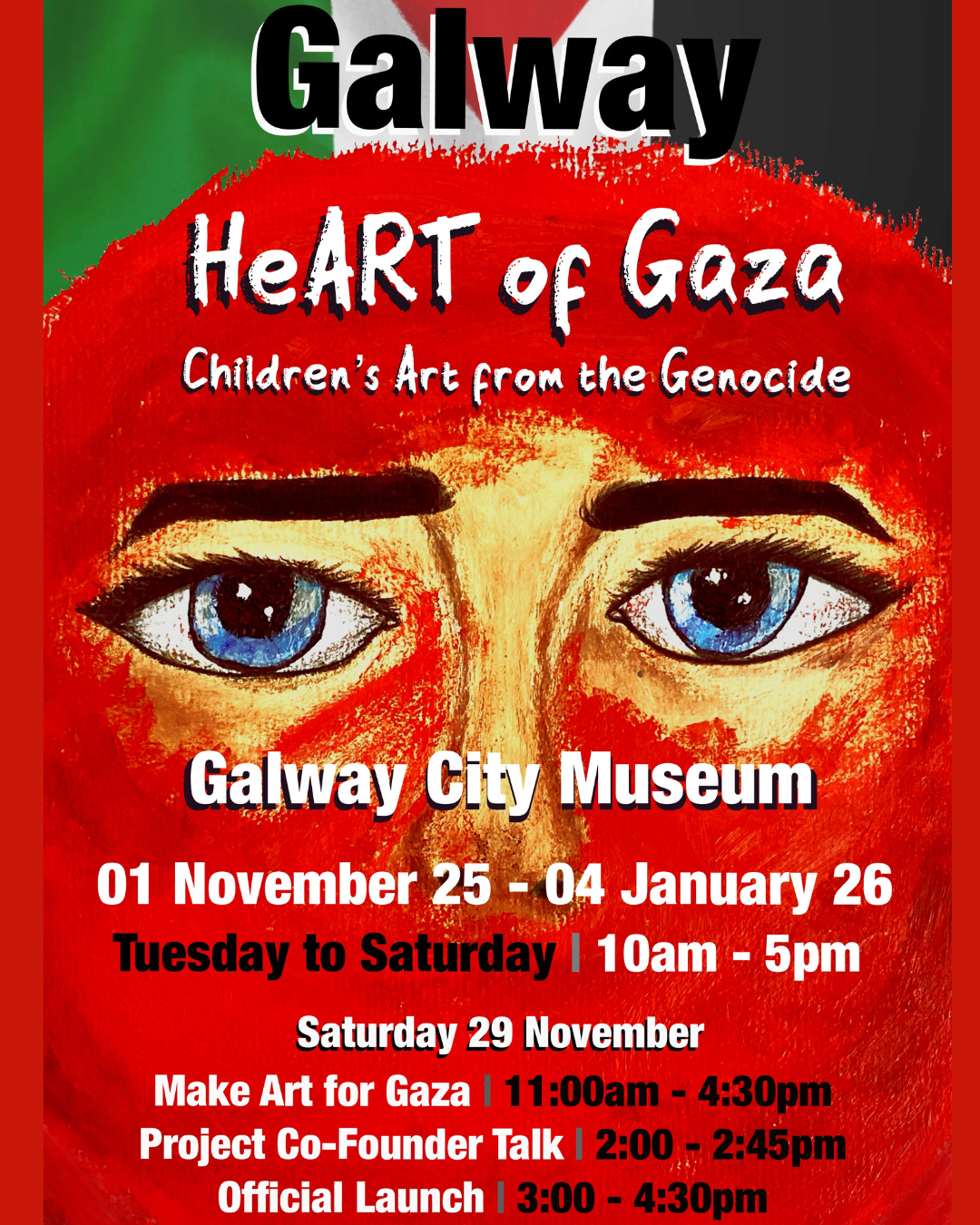 Until Sunday 4th January 2026 - 9am–1pm & 2pm–5pm Galway City Museum - Admission Free HeART of Gaza is a powerful exhibition of artworks created by 26 Palestinian children, aged 3 to 17, sharing their experiences of growing up amid unimaginable hardship. Each artwork is accompanied by a personal statement from the young artist — heartfelt words about what they love, what they miss, the people they’ve lost, and the sights they’ve seen. This emotive collection is the result of a collaboration between Mohammed Timraz, a community worker from Deir al Balah, Gaza, and Féile Butler, an architect from Sligo.