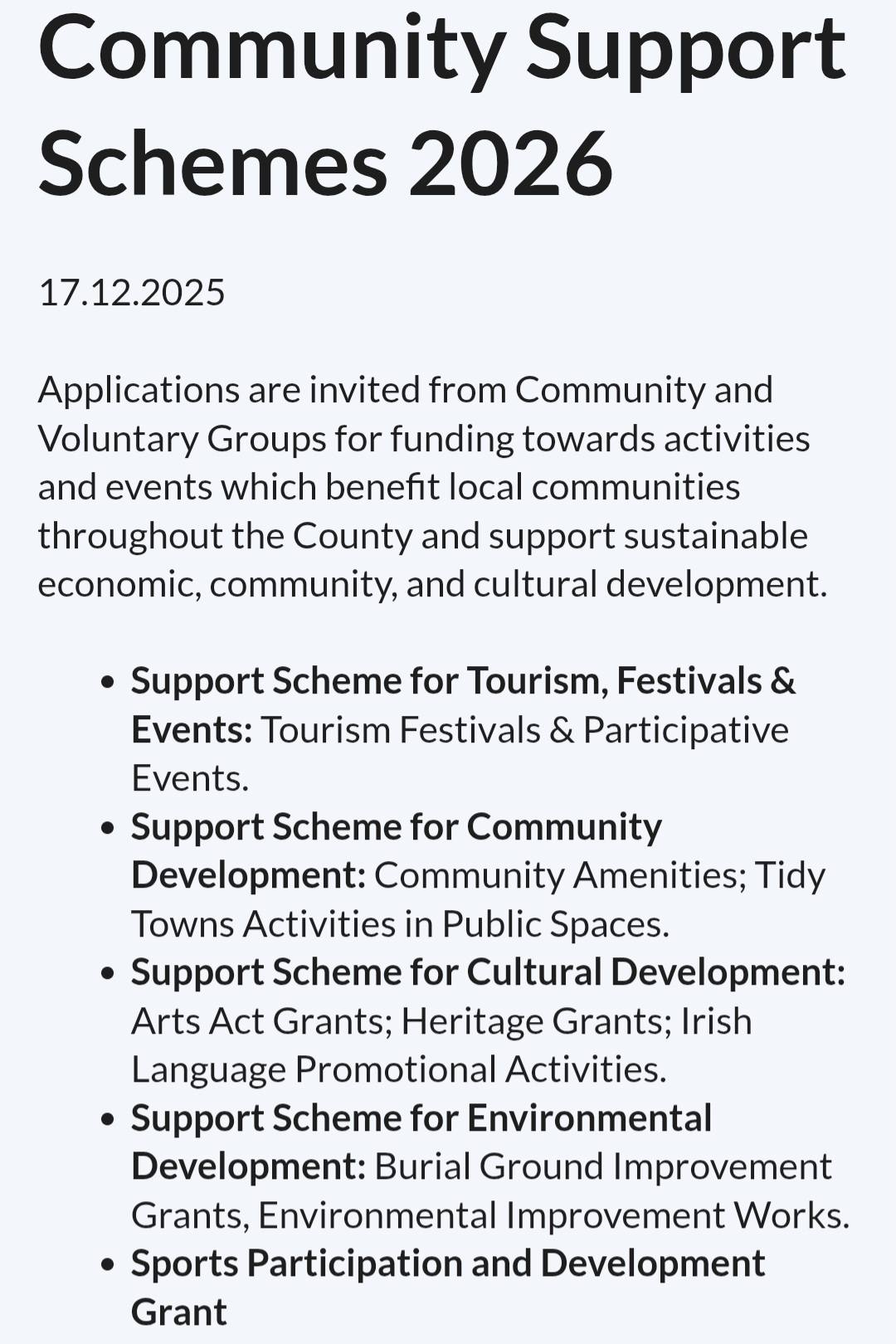 Closing date: Friday 23rd January 2026 at 4pm Galway County Council recognises that local communities are one of our greatest resources, and in recognition of this has developed the Community Support Schemes. The purpose of the support schemes is to encourage and enable community and voluntary groups to actively participate in the development of their communities, the funding is intended to support projects and events that improve all aspects of local areas and deliver benefits to the wider community. Applicants may submit a maximum of 1 application per Support Scheme. Applicants should apply via our online grants system at https://galwaycoco.submit.com/ with the exception of grant applications for Irish Language Promotional Activities which are available from gaeilge@cocogaillimh.ie Priority will be given to members of the PPN, therefore, please ensure your Group is registered at https://www.galwaycountyppn.ie/registration-form/