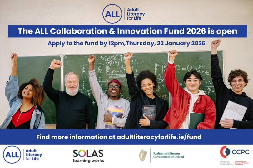Closing date: Thursday 22 January 2026 at 12pm The Collaboration and Innovation Fund is a great opportunity to fund projects and activities that support adults with unmet literacy, numeracy, digital and financial literacy needs. Who can apply? Organisations that work in the public, not-for-profit, community and voluntary sector can apply for the Collaboration and Innovation Fund. Individuals and private sector organisations cannot apply for the Fund. You need a minimum of two organisations working in partnership to apply for the Fund. Find more information about how to apply at www.adultliteracyforlife.ie/fund