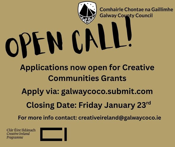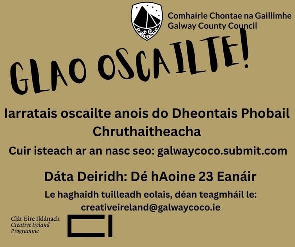 Tá Glao Oscailte Éire Chruthaitheach Chomhairle Chontae na Gaillimhe 2026 ag glacadh le hiarratais anois. Is é príomhchuspóir an ghlao oscailte seo deis a thabhairt do ghrúpaí pobail, d’eagraíochtaí, d’ionaid, d’ealaíontóirí, do thaibheoirí agus do gach duine atá bainteach leis na hearnálacha cultúir agus cruthaitheacha tionscadail/cláir ardchaighdeáin a fhorbairt a chuireann ar chumas grúpaí agus daoine aonair a lánacmhainneacht a bhaint amach agus a spreagann rochtain, eolas agus meas níos fearr ar na healaíona, ar na tionscail chruthaitheacha, ar an oidhreacht agus ar an nGaeilge. Spreagaimid pobail chun páirt a ghlacadh sa chruthaitheacht ar bhealaí nua agus nuálacha. Cuirimid fáilte roimh iarratais ó ghrúpaí nár bhain le hÉire Ildánach roimhe seo. Léigh tuilleadh