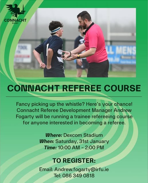 Saturday 31st January 2026 from 10am to 2pm Dexcom Stadium College Road, Galway Connacht Referee Development Manager Andrew Fogarty will be running a trainee refereeing course for anyone interested in becoming a referee. To register: Email Andrew.fogarty@irfu.ie Tel.: 086 349 0818