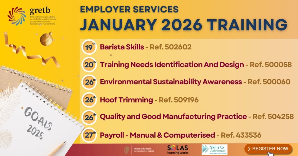 Starting 10th February 2026 LEO Galway has announced their 2026 schedule of training courses for entrepreneurs, small businesses and people thinking about starting-up! These programmes book out fast so make sure you book early to avoid disappointment. Read More