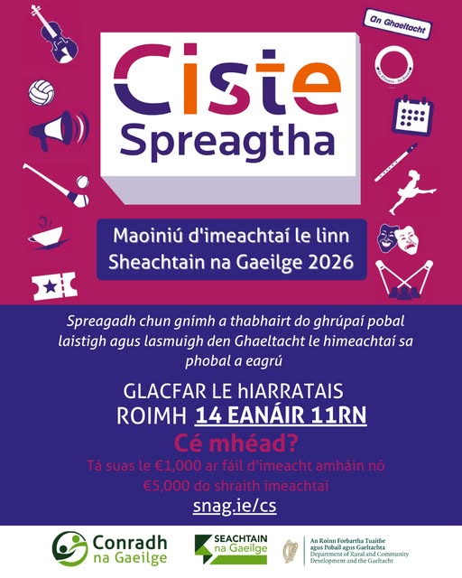 Spriocdháta: 14 Eanáir 2026 ar 11rn Tá babhta a 1 den Chiste Spreagtha oscailte anois do 2026! Tá go dtí 14 Eanáir ar 11rn agaibh le cur isteach ar an mhaoiniú seo d'imeachtaí a bheas a titim amach le linn Sheachtain na Gaeilge (1-17 Márta 2026). Tá an t-eolas ar fad & foirm cláraithe le fáil ar snag.ie/cs
