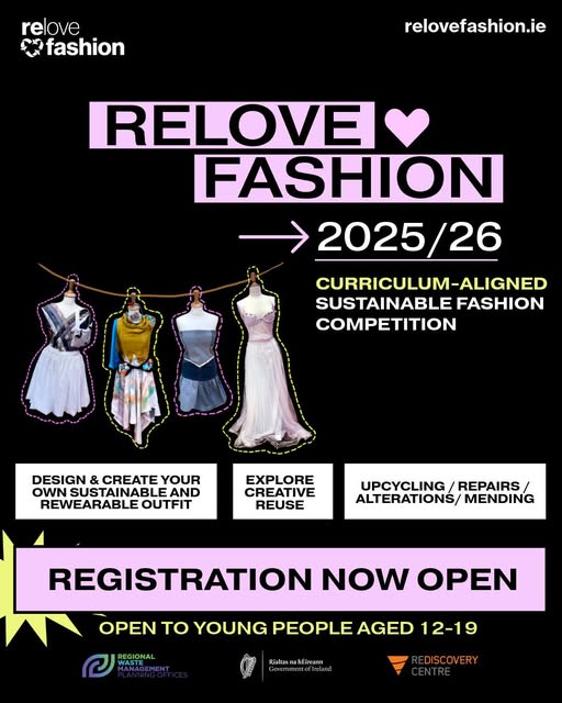Relove Fashion provides an exciting project for young people to explore creative design skills while fostering an understanding of sustainability and the environmental impact of our clothes. The competition can be undertaken as a project within Secondary Schools, Irish Girl Guide and Scouting groups, Youthreach and more. By participating, young people will not only design a one-of-a-kind sustainable fashion piece but also gain hands-on experience in real-world sustainability projects while having fun. Read More