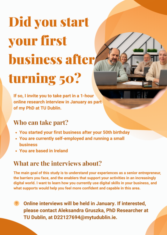 The online interview will be held in January 2026 Did you start your business after turning 50? If so, we would like to invite you to take part in a 1-hour online research interview in January as a part of a PhD at TU Dublin. The main goal of this study is to understand your experience as a senior entrepreneur, , the barriers you face, and the enablers that support your activities in an increasingly digital word. The online interview will be held in January, if you are interested, please contact Aleksandra Gruszka, PhD Researcher at TU Dublin, at D22127694@mytudublin.ie