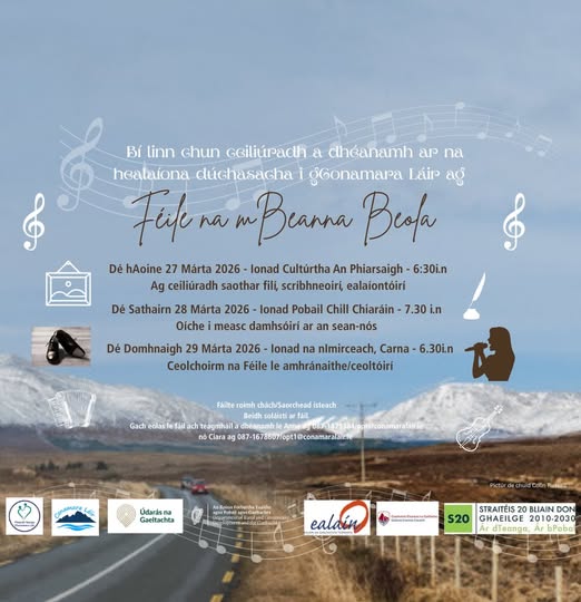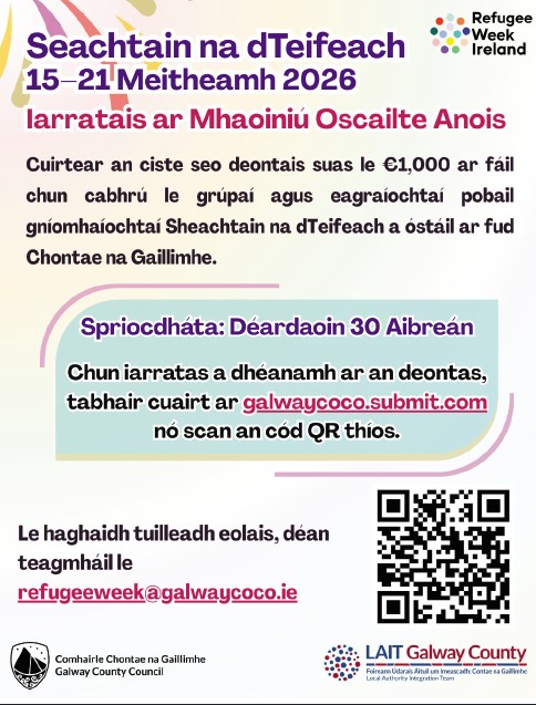 Spriocdháta: Dé hAoine 10 Aibreán 2026 Tá iarratais ar oscailt anois do Ghradaim an Chathaoirligh 2025 ar tionscnamh bliantúil iad chun aitheantas Gaeilge) a thabhairt do thiomantas daoine aonair agus grúpaí a ghlacann páirt i ngníomhaíochtaí pobail agus deonacha i gContae na Gaillimhe agus chun aitheantas a thabhairt don tionchar suntasach a bhíonn ag a ngníomhartha ar saol an phobail. Is comhfhiontar iad na Gradaim idir Comhairle Chontae na Gaillimhe agus an Líonra Rannpháirtíochta Poiblí, a bhfuil os cionn 1,300 Ballghrúpa i mbun raon gníomhaíochtaí pobail agus deonacha ar fud an Chontae. Le tuilleadh eolais a fháil, déan teagmháil le awards@galwaycoco.ie nó https://www.galway.ie/.../gradaim.../gradaim-chathaoirligh nó leis an gComhairleoir David Collins, Cathaoirleach, ag 087 7831687.