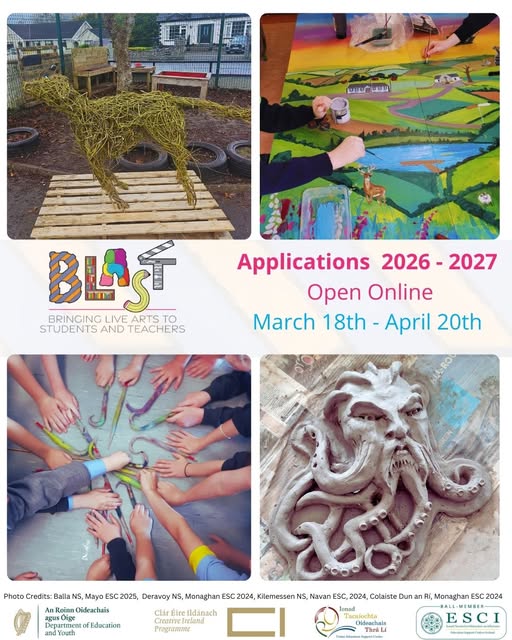 Closing date: Monday 20th April 2026 Bringing Live Arts to Students & Teachers (BLAST) in Primary, Special and Post-Primary Schools and Youthreach Centres. Pupils in schools all over the country work with professional artists/creative practitioners on imaginative and joyful projects. BLAST gives them the time and the space to design and develop innovative residencies meant to foster their creativity and to develop their collaboration skills, critical thinking and problem-solving abilities. Further information on BLAST, Guidelines and the Online Application Form are available from: https://www.gov.ie/…/services/blast-arts-in-education