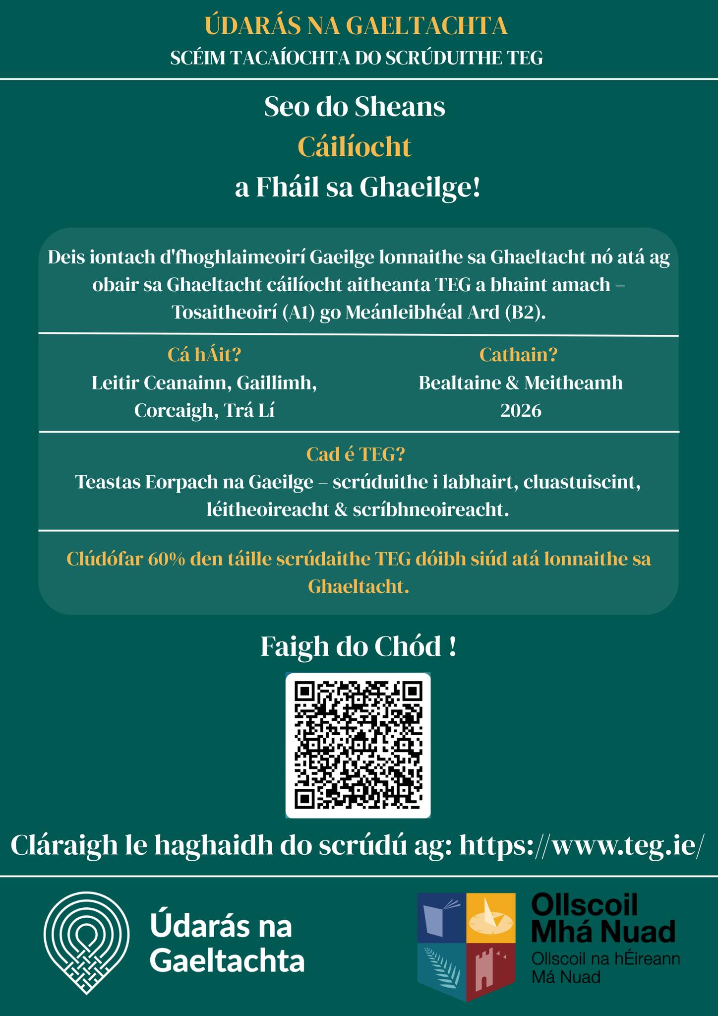 Tá scéim tacaíochta á chur ar fáil ag Údarás na Gaeltachta do dhaoine atá lonnaithe sa Ghaeltacht atá ag iarraidh cáilíocht Teastas Eorpach na Gaeilge (TEG) a bhaint amach. Tríd TEG, cuirtear sraith scrúdaithe agus cáilíochtaí ar fáil do dhaoine fásta atá ag foghlaim Gaeilge agus tugann sé deis d'iarrthóirí, ó leibhéil A1 go B2 (Tosaitheoirí go Meánleibhéal Ard), a gcumas a dheimhniú sa labhairt, sa chluastuiscint, sa léitheoireacht agus sa Ghaeilge scríofa. Ionaid i Leitir Ceanainn, Gaillimh, Ciarraí & Corcaigh, Bealtaine & Meitheamh 2026 Cláraigh leis an Údarás agus gheobhaidh tú cód le húsáid agus tú ag clárú do TEG. Údarás na Gaeltachta - Scéim Tacaíochta do Scrúduithe TEG