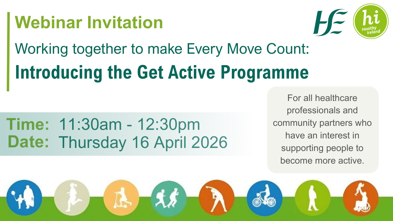 Thursday 16th April 2026, from 11:30am to 12:30pm - Online The ‘Working together to make Every Move Count’ webinar series launches in April this year. The webinar series aims to support healthcare professionals and community partners who have an interest in supporting people to become more active. Over the course of a four-webinar series, information on a wider range of supports will be shared. The first webinar in the series titled, Introducing the Get Active Programme, takes place on Thursday 16 April, at 11:30am. Register here