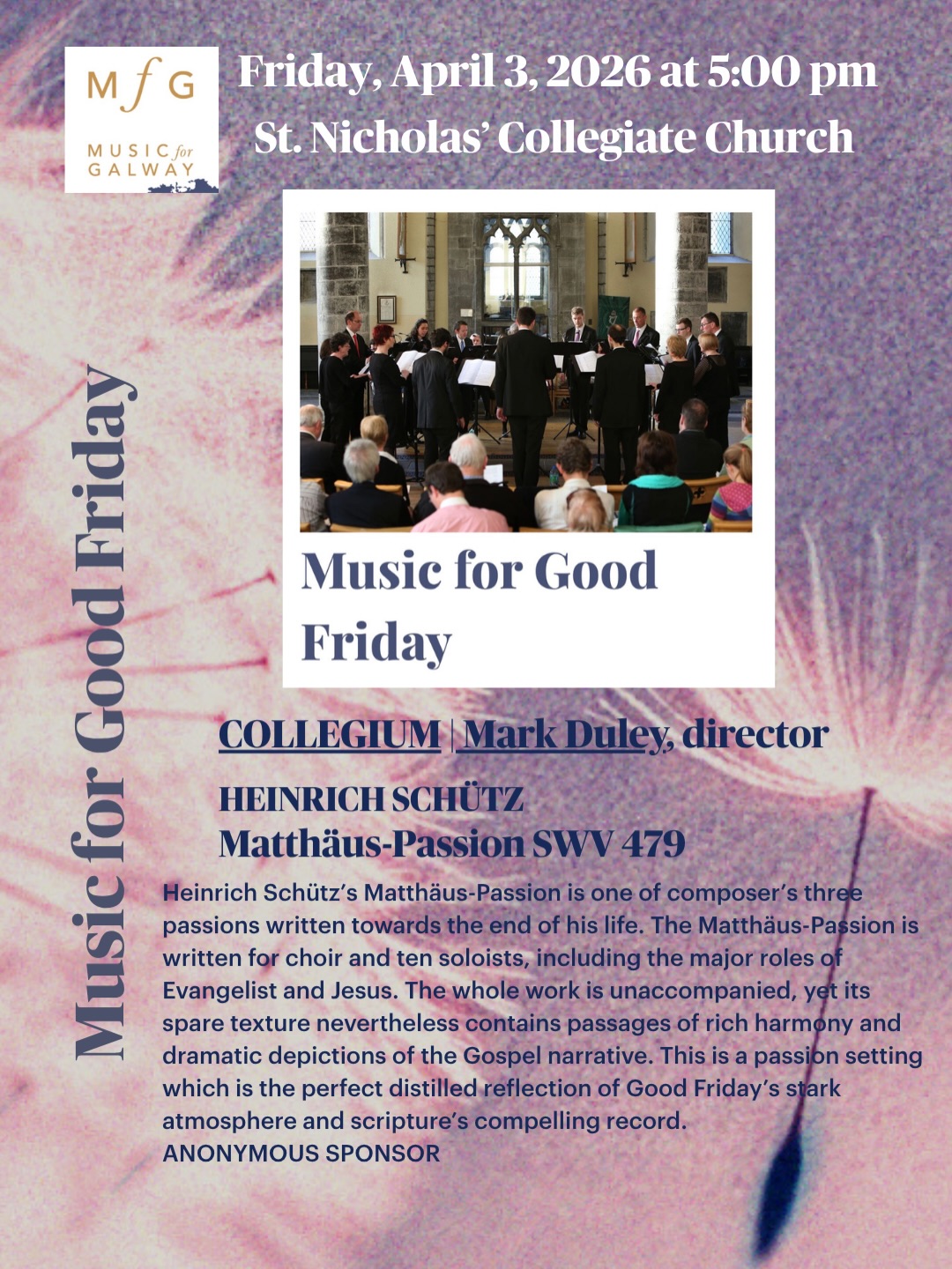 Friday 3rd April 2026 at 5:00 pm - St. Nicholas’ Collegiate Church, Galway City COLLEGIUM | Mark Duley, director - HEINRICH SCHÜTZ Matthäus-Passion SWV 479 Heinrich Schütz’ Matthäus-Passion is one of composer’s three passions written towards the end of his life. These passions, and in particular the Matthäus-Passion, represent the crowning achievement of the greatest German composer of the seventeenth century, and paved the way for the later settings of J.S. Bach and others. The Matthäus-Passion is written for choir and ten soloists, including the major roles of Evangelist and Jesus. The whole work is unaccompanied, its spare texture nevertheless containing passages of rich harmonies and dramatic depictions of the Gospel narrative. This is a passion setting which is the perfect distilled reflection of Good Friday’s stark atmosphere and scripture’s compelling record. For more information, please visit Music for Good Friday - Music for Galway