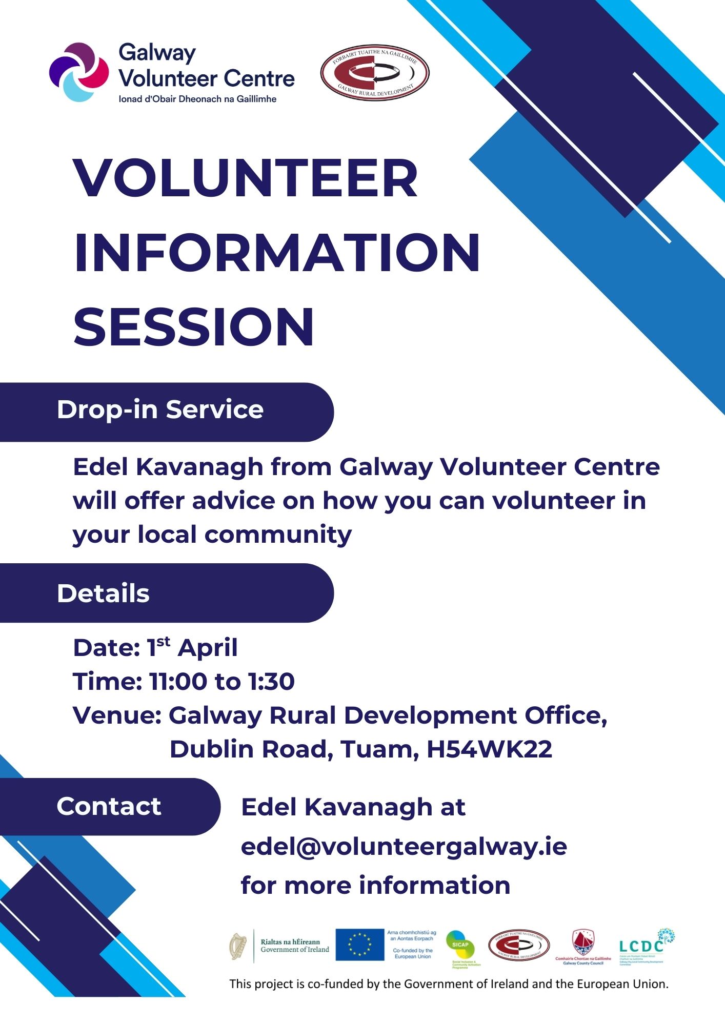 Wednesday 1st April 2026 from 11am to 1:30am GRD Office, Dublin Road, Tuam H54 WK22 Edel Kavanagh from Galway Volunteer will host a one-to-one information session in the GRD Office Tuam with anyone interested in becoming a volunteer in Galway County. If you are interested contact Edel at edel@volunteergalway.ie. Please note that GVC can support volunteers with garda vetting.
