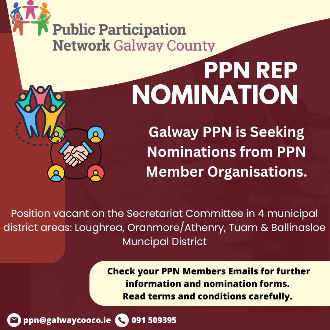 Closing date: Ongoing Dear PPN members, Nominations are now being sought for the role of PPN Secretariat Member representing the Social Inclusion Pillar. Full details of the role can be found here.. Please find attached PPN Nomination Form for Secretariat Membership below: PPN Nomination Form for Secretariat Membership If you have any queries about this application form please email ppn@galwaycoco.ie Completed Nomination Forms must be submitted on or before the closing date. Completed form need to be returned via email to: ppn@galwaycoco.ie